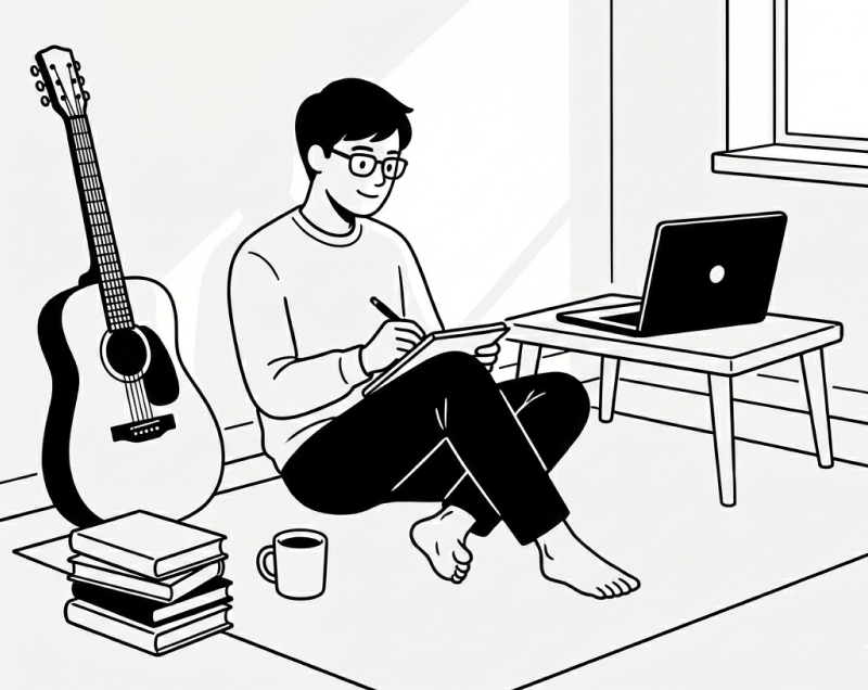 平日の夜や休日は、音楽活動などの創作活動や、新たなスキル(ライティングやWebデザインなど)の習得に投資したのです。